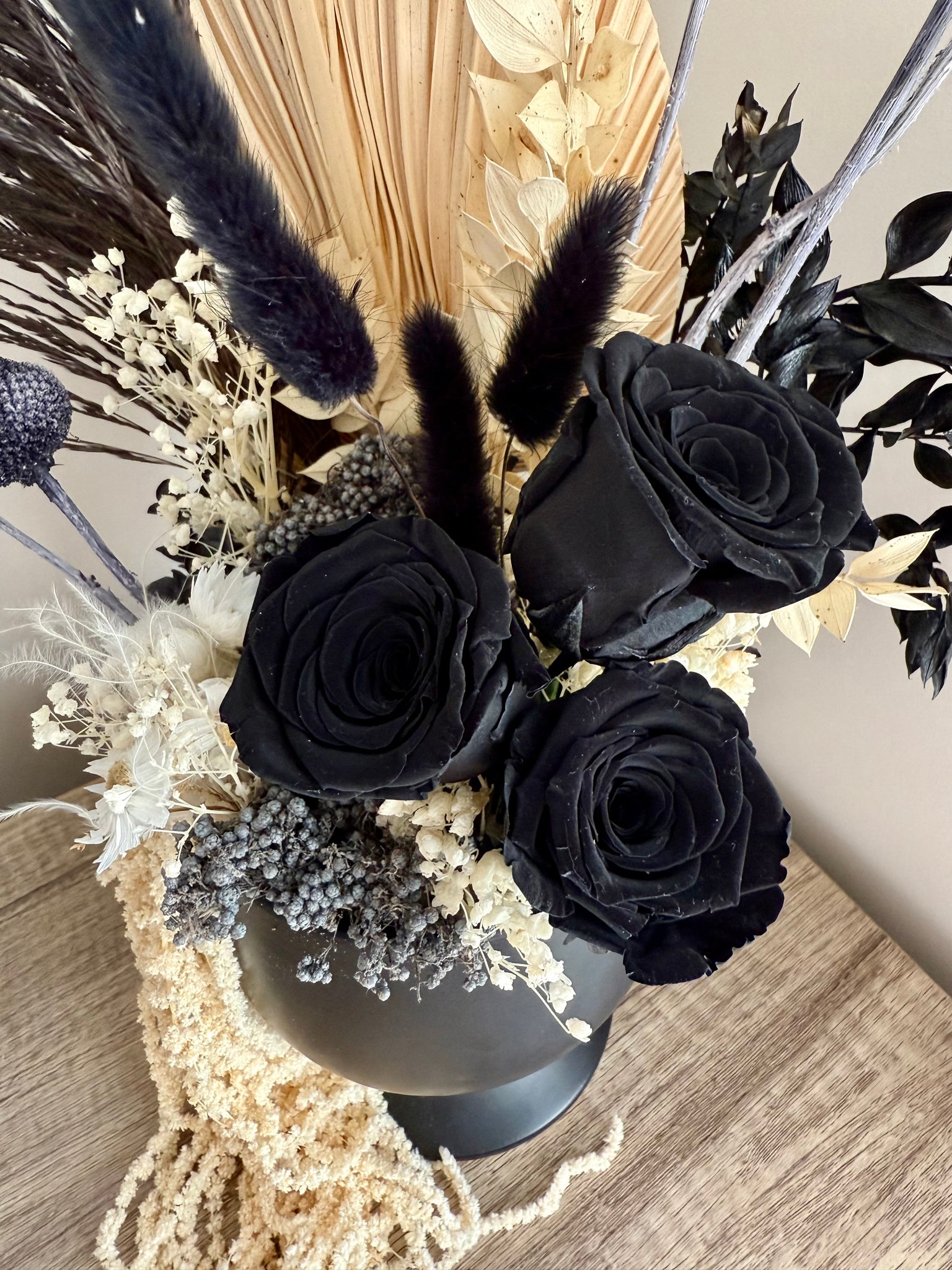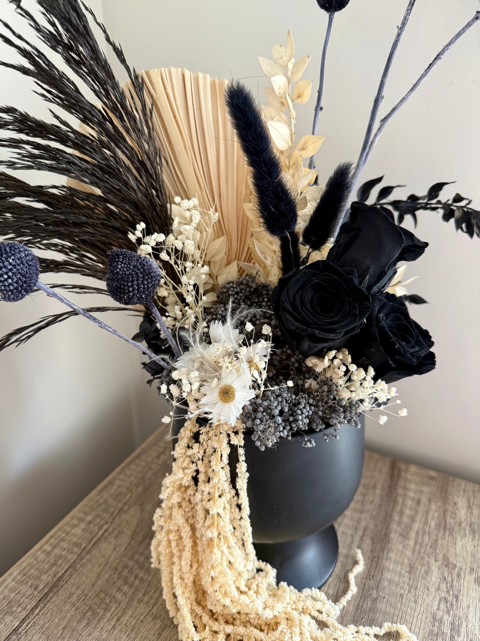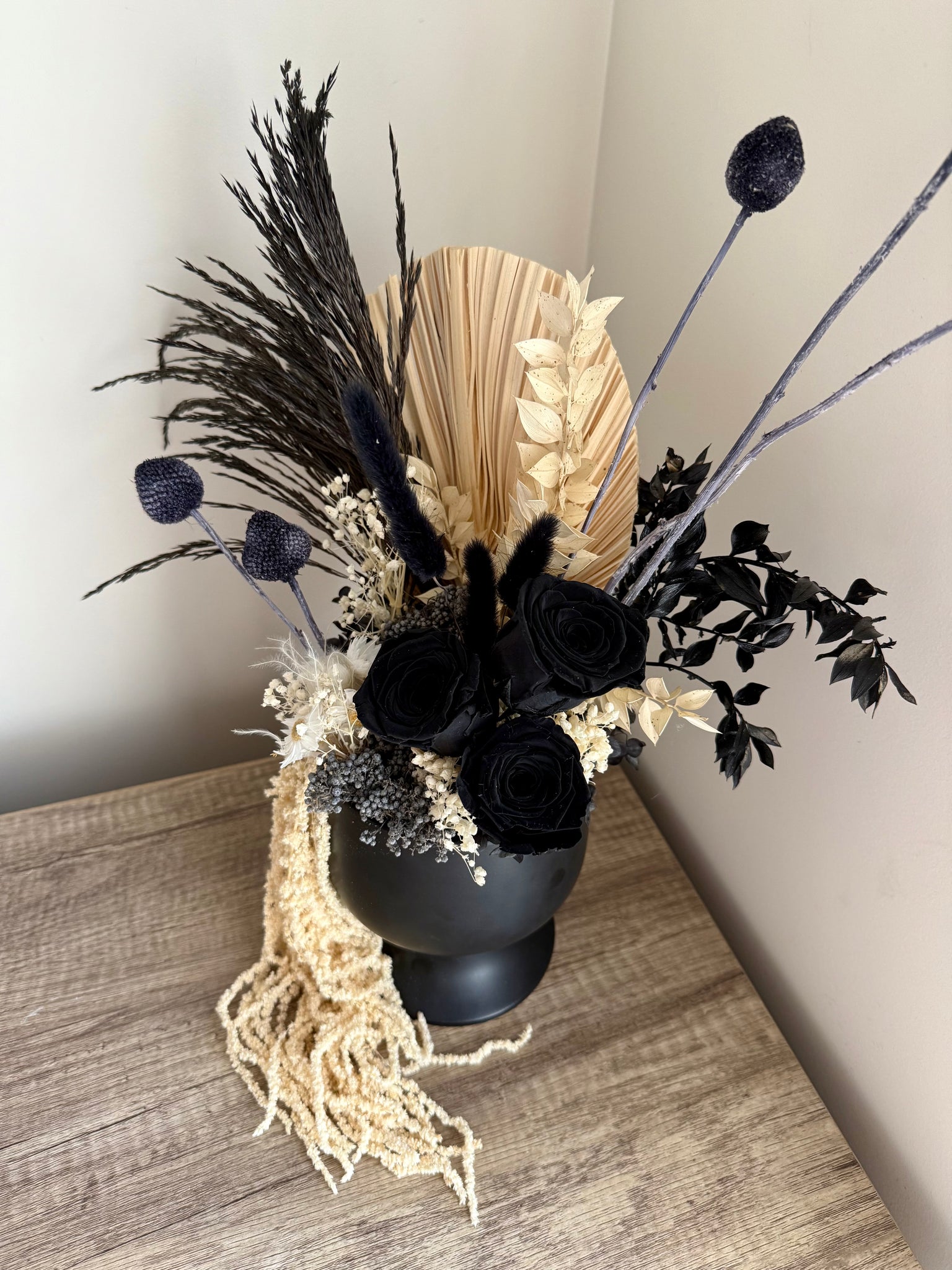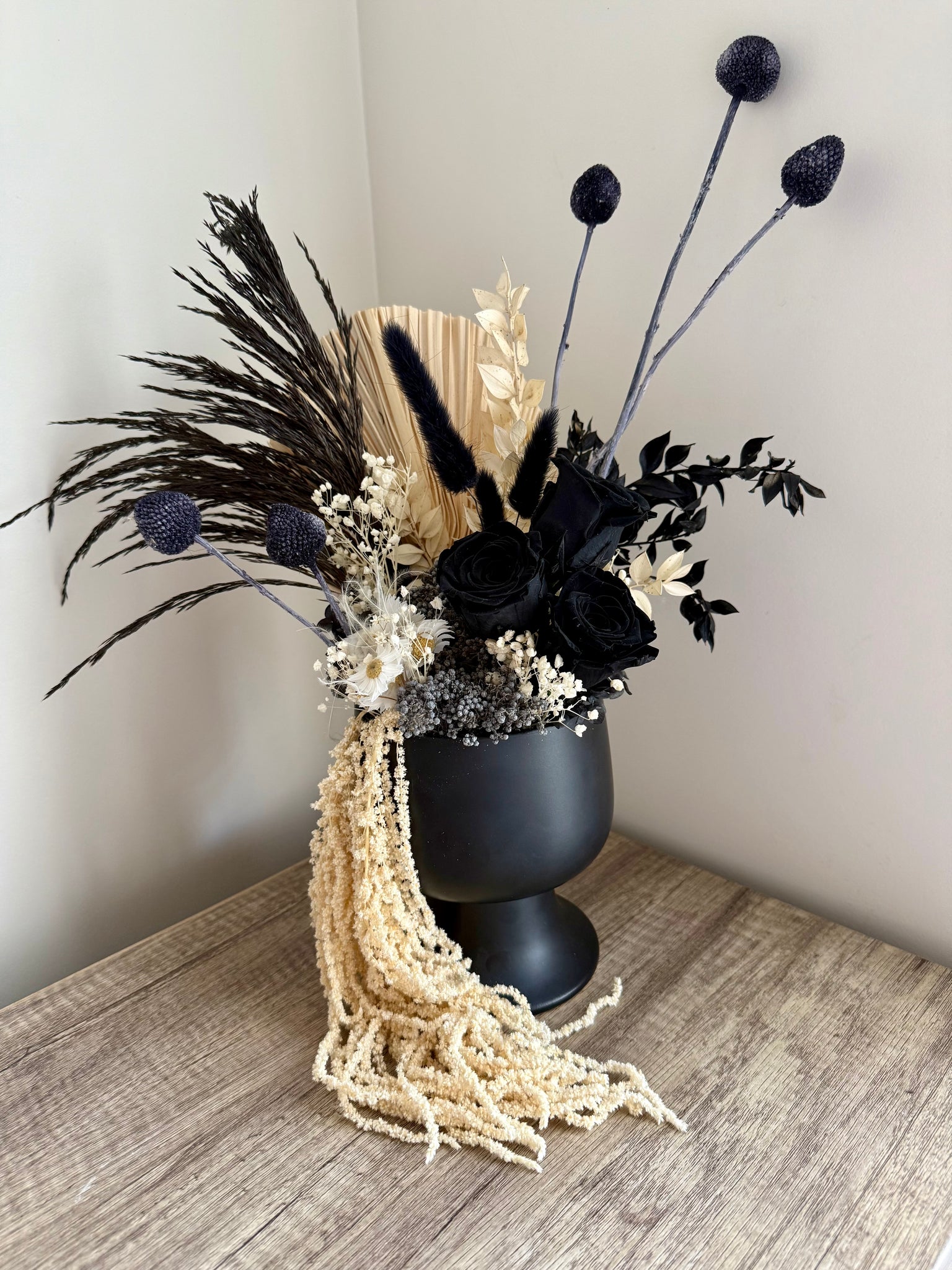 Bring a touch of elegance and drama into your space with this modern dried flower arrangement. Featuring striking black roses, textured foliage, and cascading amaranthus, this design blends bold black tones with soft natural neutrals for a stunning contrast. Displayed in a matte black vase, it’s perfect as a unique home décor piece, a statement centerpiece, or a one of a kind gift. Handcrafted with premium dried and preserved flowers, this arrangement offers long-lasting beauty without the need for water or maintenance. Ideal for lovers of modern, moody, and timeless floral styling.